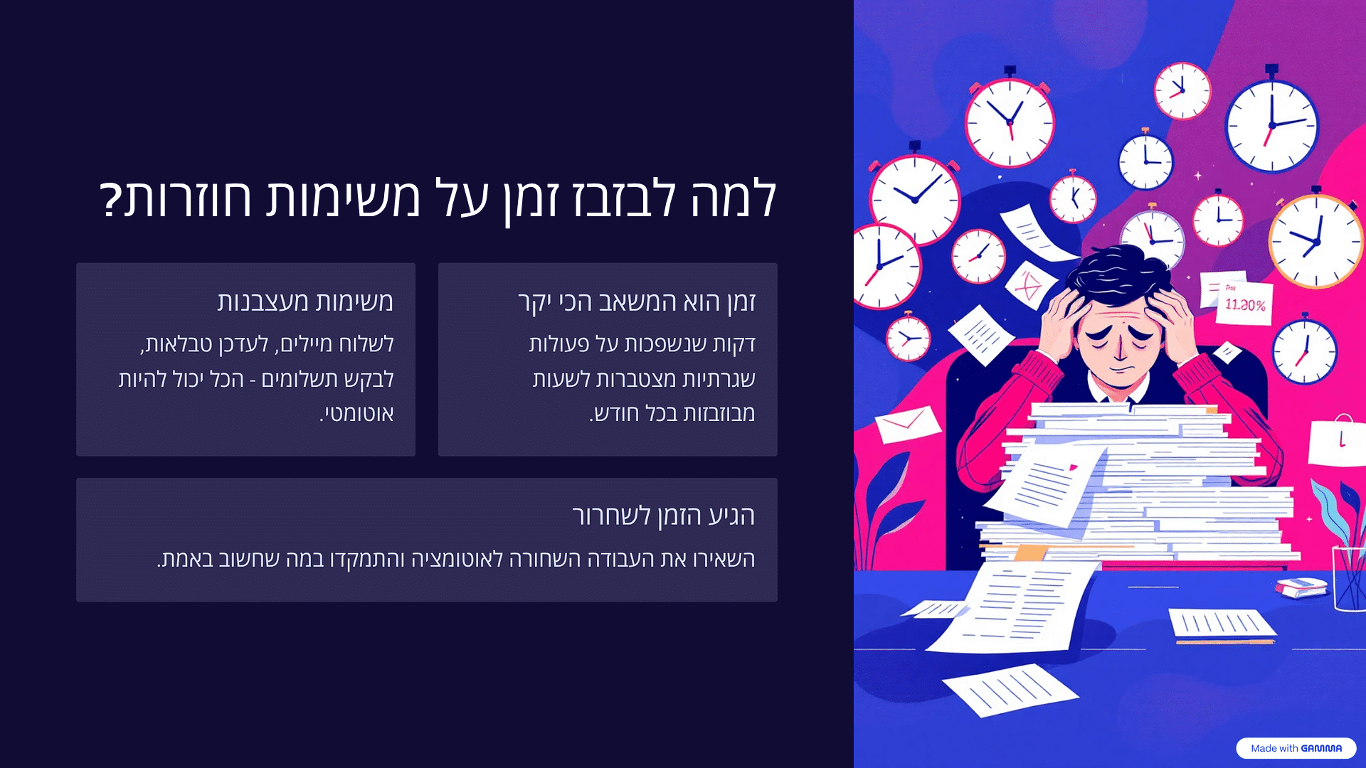 בעולם שבו הזמן שווה כסף והטכנולוגיה מתקדמת במהירות עצומה, עסקים שלא מיישמים אוטומציה פשוט נשארים מאחור.
