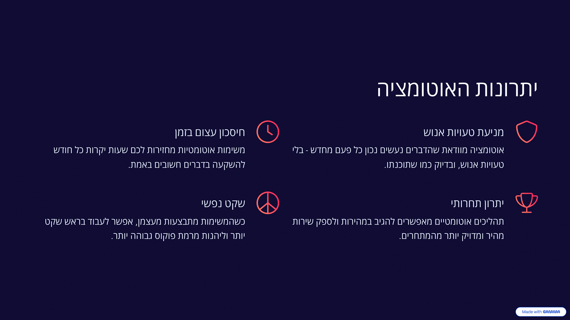 העסקים שידעו לשלב אוטומציה חכמה בכל רובדי הארגון ייהנו מיתרון תחרותי ברור.