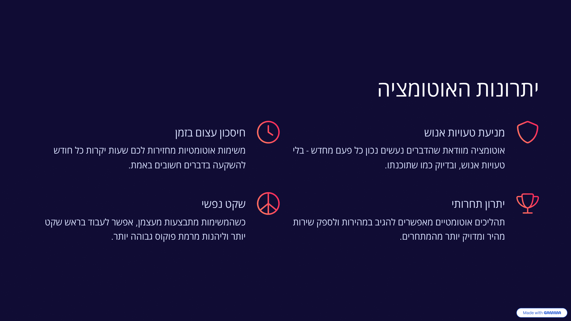 העסקים שידעו לשלב אוטומציה חכמה בכל רובדי הארגון ייהנו מיתרון תחרותי ברור.